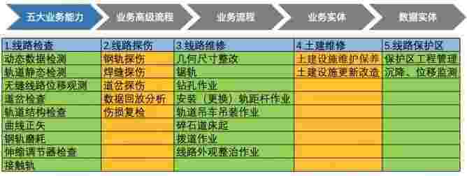 在轨道运维业务中,,,,,,,,,,,我们形成了完整的从业务能力(业务域)-业务流程-业务实体-数据模型的分析梳理过程。。。。。。。轨道运维业务能力如下图所示::::::::::